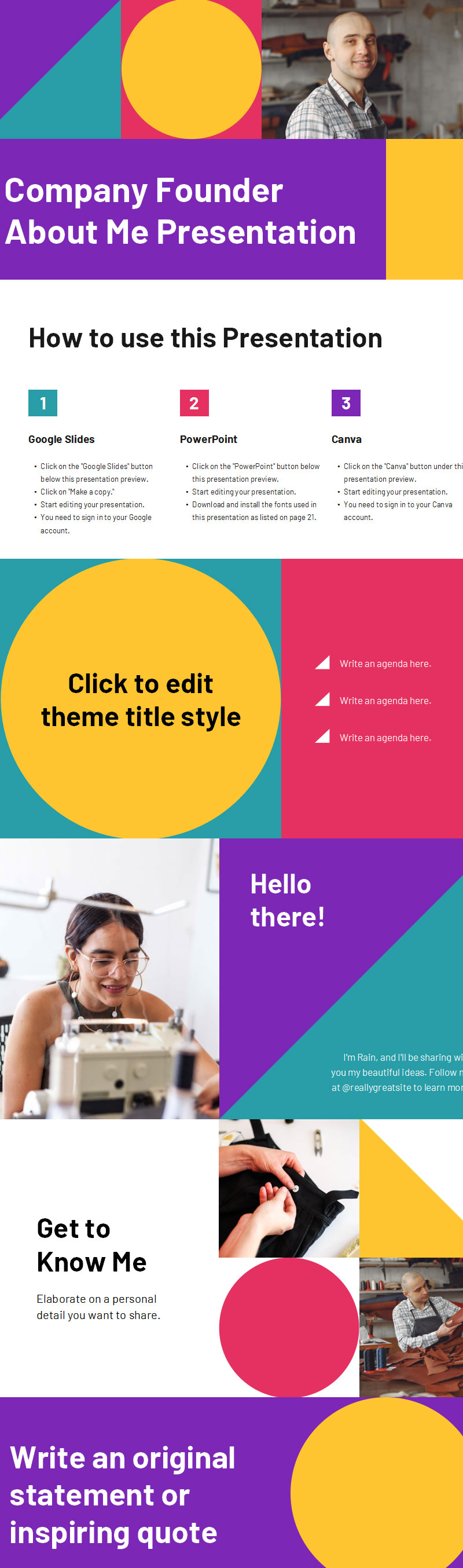 这个开朗开朗的 Company Founder About Me 模板对普通观众很有吸引力。这些幻灯片具有相关性和吸引力,将帮助人们了解品牌背后的真实人物。每张幻灯片都是完全可定制的,这意味着您可以应用自己的图像、照片、文本、配色方案、字体、元素、图标等。您可以使用简介幻灯片填写您的个人详细信息,使用团队成员幻灯片介绍您的同事,并使用时间线幻灯片讲述您的公司故事。上传视频和音频,让您的故事更加生动。