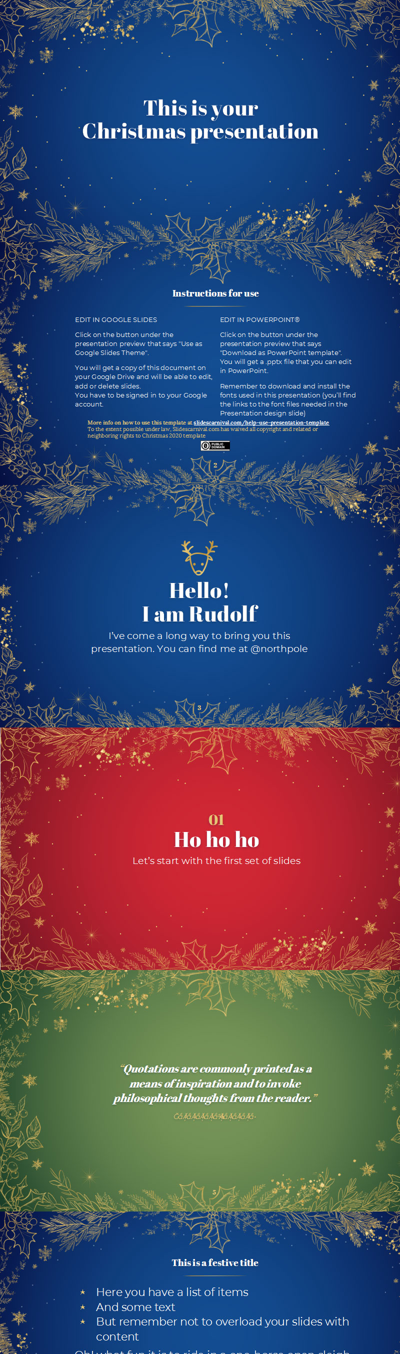 你最喜欢的圣诞颜色是什么?蓝色、红色、绿色、白色……您可以在这个免费的圣诞节演示文稿模板中使用其中任何一种。用这种优雅的设计为您的ppt幻灯片幻灯片增添一些圣诞气氛。所有幻灯片都有一个冬季树叶框架,由于其金色,从背景中脱颖而出。但最棒的是,您可以使用任何背景颜色:蓝色、红色、绿色……圣诞节适合您的任何颜色。用它以特殊的方式向您所爱的人发送最美好的祝福,或者为朋友、家人和客户制作圣诞贺卡。它是在公共领域许可下发布的,因此无需保留学分!