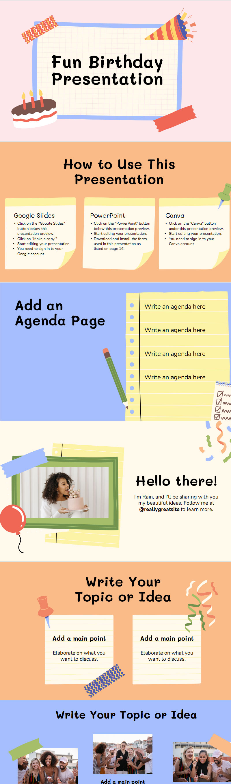 这些有趣的生日幻灯片将为您的派对计划注入活力。欢快柔和的配色方案和古怪的卡通图标使此模板非常适合传达您的观点:让我们庆祝一下。首先,查看操作方法幻灯片,了解如何将此模板用作生日快乐 。然后通过主题和创意页面、大量的图像和文本空间以及元素和图标的资源页面开始您的创作过程。轻松将议程幻灯片调整为聚会日程或将团队成员幻灯片更改为宾客名单。您知道您的聚会会取得成功,但乐趣现在才开始