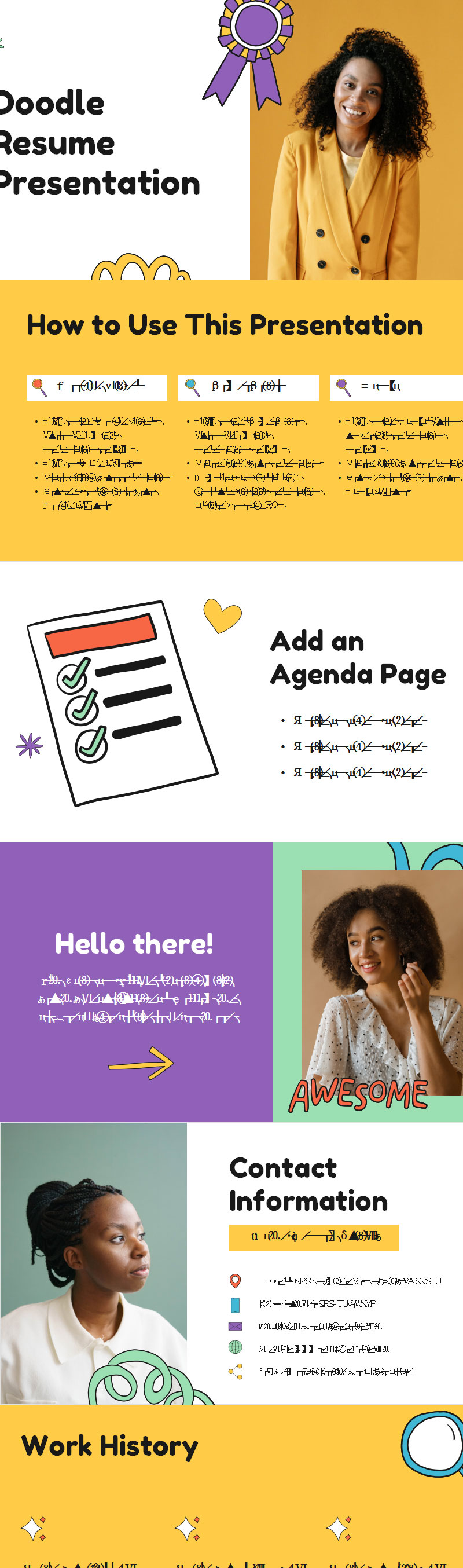您会爱上这款适用于ppt 的涂鸦简历模板的古怪风格。这些幻灯片有趣且平易近人,阐明了所有基础知识:联系信息、工作经历、教育背景、技能和熟练程度、人物推荐等等。与更传统的简历模板不同,您可以为项目和演示文稿自定义此模板。添加时间表、统计数据和图表、团队成员、议程、主题和想法。上传您自己的图像、照片和插图来个性化此布局。