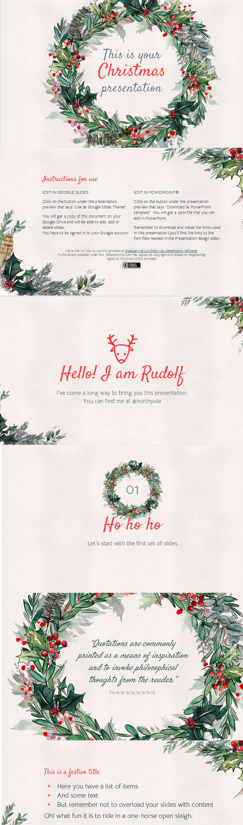 这个免费的演示ppt文稿模板非常适合您的观众。封面中的冬青花环将帮助您以正确的圣诞气氛开始。此外,此设计中的所有幻灯片都装饰有冬季树叶,传达出一种温馨的平静信息。请记住使用包含的图形资源来为您的内容赋予个人风格。用这个温馨的主题以特殊的方式送上你最美好的祝福。它是在公共领域许可下发布的,因此无需保留学分!