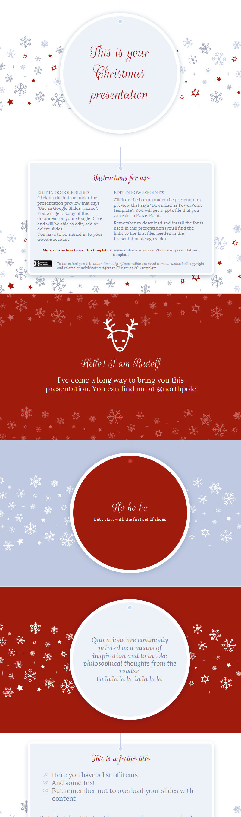 享受这个免费的圣诞节演示文稿模板,您可以在 ppt幻灯片中使用它。设计微妙而优雅,以雪花和星星为背景,此外,随附的可爱圣诞图标将让您的观众沉浸在节日气氛中。在幻灯片中珍藏您的特别回忆,用它来发送您的圣诞照片或为朋友和家人制作特别的圣诞贺卡。它是在公共领域许可下发布的,因此无需保留学分幻灯片,可将其用于您想要的任何目的。如果这个主题不能完全满足您的需要,请记住您可以使用其他圣诞模板。享受它,祝大家圣诞快乐!