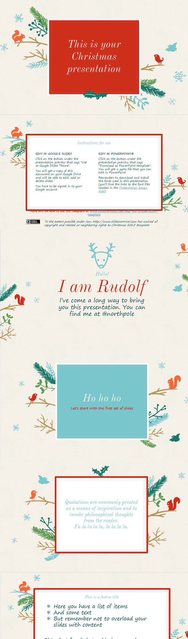 圣诞节又临近了,作为礼物,我为您设计了这个特别的免费演示模板。用它来发送您的圣诞照片、家庭问候,或在节前在公司开会。凭借其喜庆的设计和可爱的圣诞图标,它会让每个人都微笑。此外,它是在公共领域许可下发布的,因此无需保留致谢名单。如果此设计不能完全满足您的需求,请记住您可以使用其他圣诞节模板。享受模板,祝大家圣诞快乐!