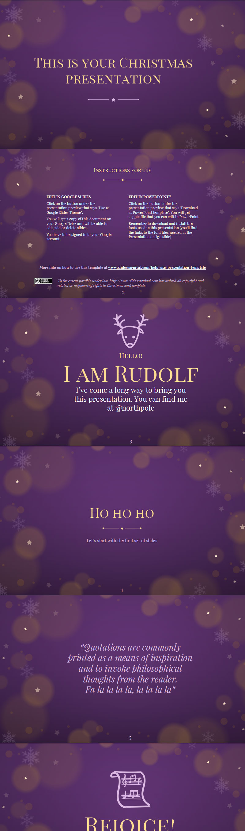 下载这个特殊的圣诞节免费演示文稿模板,并将其用于发送您的圣诞节照片、家庭问候,或在假期前的学校课堂上使用它。凭借优雅的星夜设计和可爱的圣诞图标,您的观众将沉浸在圣诞气氛中。此外,它是在公共领域许可下发布的,因此无需保留学分幻灯片,可将其用于您想要的任何目的。如果此设计不能完全满足您的需要,请记住您可以使用其他圣诞节模板。享受模板,祝大家圣诞快乐!