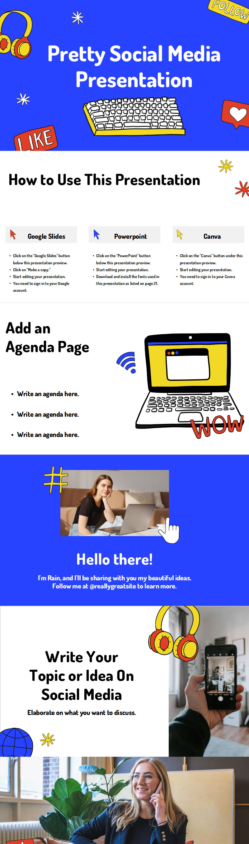 这个蓝色、红色和黄色的 ppt模板是两全其美的:引人注目且易于使用。为议程和时间表、社交媒体资料、主题和想法、照片和标题、图表和图形、团队成员页面等填写现成的页面。所有幻灯片都是完全可定制的,因此您可以根据您正在进行的任何个人或专业项目调整它们。保持配色方案和字体组合不变或进行更改。
