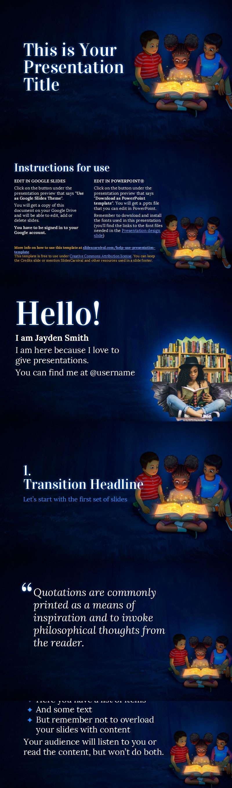 使用这个插图精美的免费 ppt幻灯片模板,为您的演示文稿增添一些乐趣。让这些孩子发现阅读的魔力伴随您的内容,让您的观众大吃一惊。您还会发现许多图形元素可以丰富您的内容,因此利用不同的布局、地图、图形和图标让您的幻灯片更加直观。这个主题非常适合与图书馆和阅读相关的演示,也适用于您可以从书中学到的任何主题:历史、艺术、文学等。