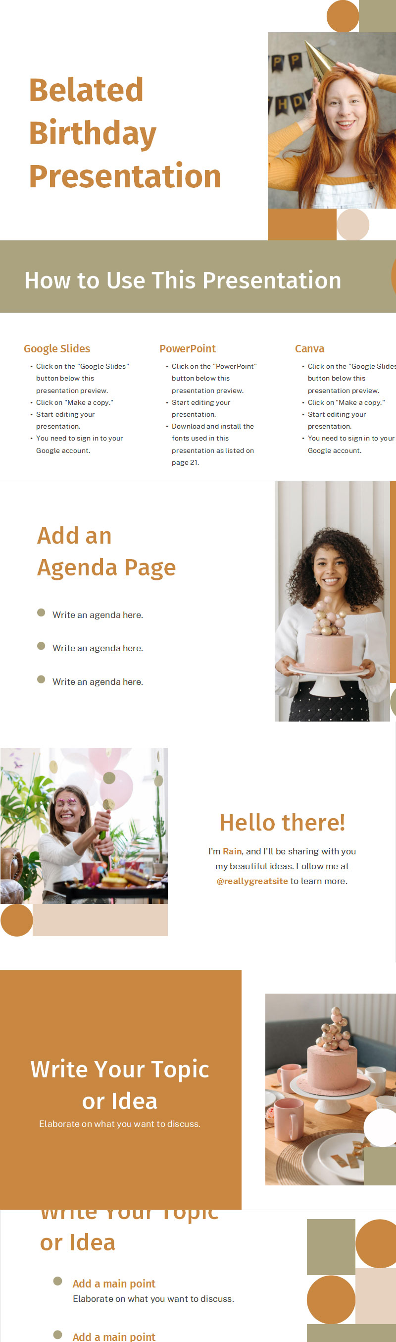 这个温馨开朗的迟到生日模板是表达关心的完美方式。几何图标和诱人的大地色调使其脱颖而出。使用已有的配色方案和布局,或从头开始创建您自己的配色方案和布局。设计为完全可定制,您可以添加或删除文本框、插入您自己的照片和图像、选择您自己的字体或重新排列元素和图标。如果您计划与家人或朋友举办一场迟来的生日派对,您可以协作设计并轻松与他人分享。轻松组织并享受过程。