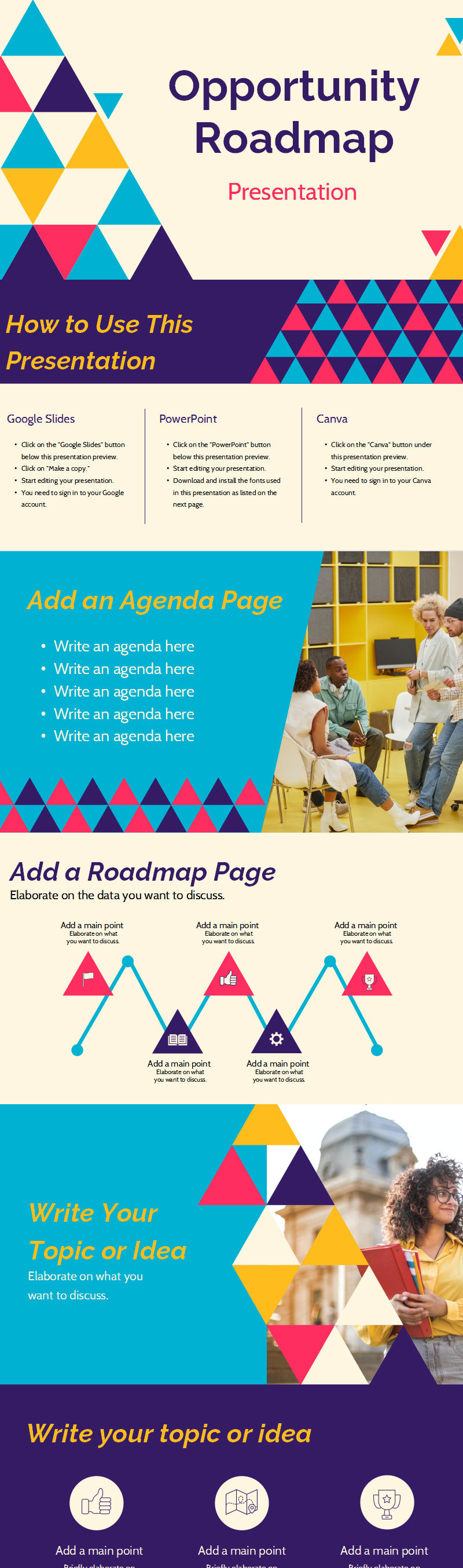 当机会来临时,制定路线图。此机会路线图经过专业设计和完全可定制,非常适合用作 ppt模板或 Canva 主题。制定您的选择,权衡利弊。放入维恩图以找到中间立场。绘制您的决定并跟踪您的进度。添加图像、图标、插图和其他图形,使前进的道路尽可能清晰。