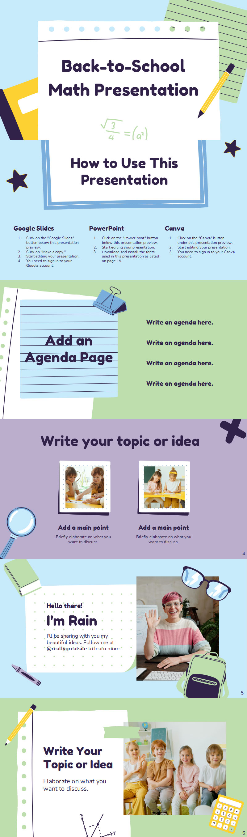 准备好自信地开始新学年了吗?这个剪贴簿风格的淡蓝色和绿色返校模板将帮助您组织和准备您的课程计划。添加议程、主题和想法、鼓舞人心的陈述和引语、时间表等。您可以将团队成员页面调整为班级成员页面,并将图表幻灯片用作学生的座位表。这就是这个模板的美妙之处——它是完全可定制的,可以为您的创意做好准备。您还会发现三张包含学校主题元素和图标的资源幻灯片。