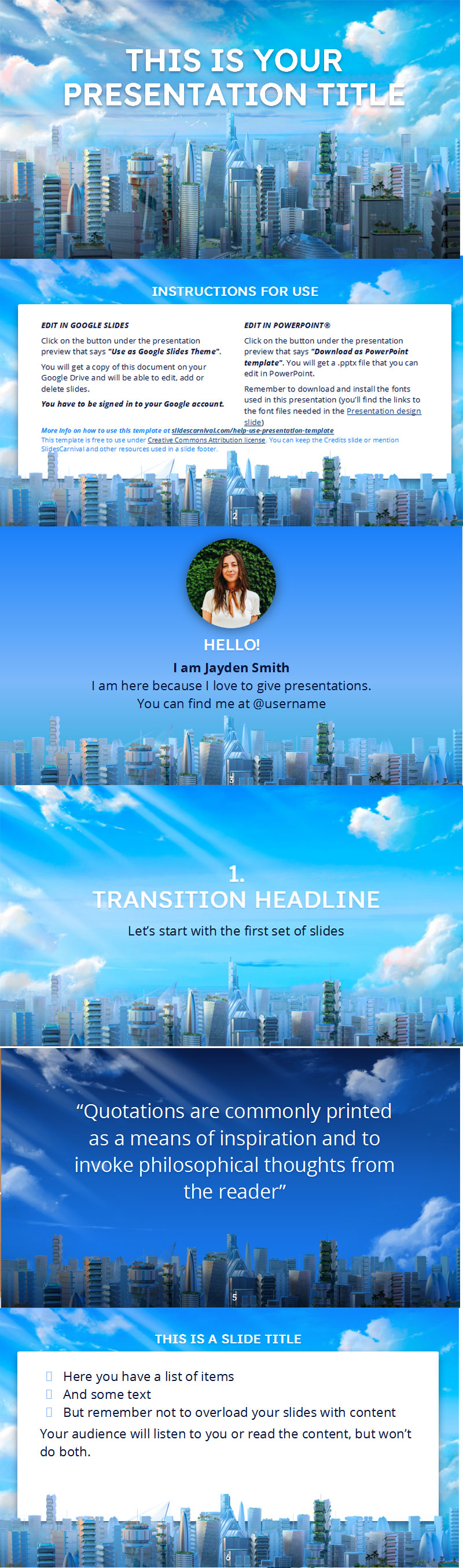 享受这个专注于生态和绿色城市概念的免费ppt模板,用于您的ppt幻灯片演示文稿。这个鼓舞人心的设计以不久的将来的绿色城市天际线为例(我希望如此!)。这个主题的调色板以蓝色和绿色为主,代表干净的天空和丰富的植被,使您的演示与环境主题相协调。图形元素将帮助您尽可能清楚地传达您的内容,因此请毫不犹豫地使用包含的不同布局、地图、图形和图标。如果您想谈论生态、可持续性、清洁能源、生态友好型建筑或绿色城市概念,这个主题是一个不错的选择。