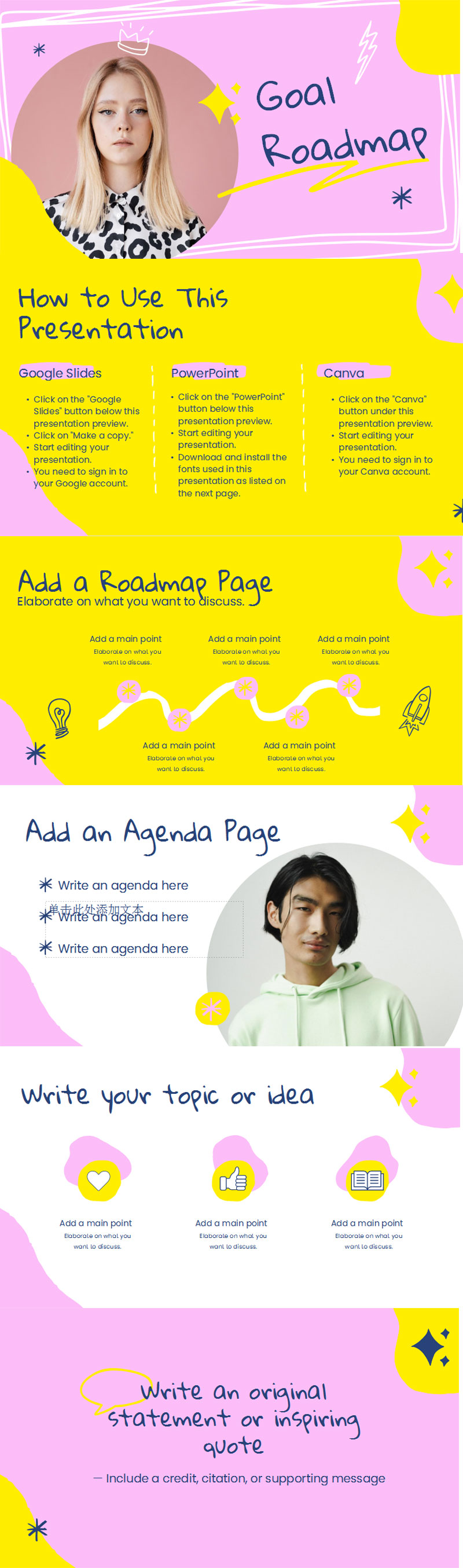 你知道你想去哪里吗?把你的目标定在石头上,这样你就可以自信地行动。无论您是处理学校项目还是启动新的工作项目,这些幻灯片都将帮助您保持正轨。这些幻灯片经过专业设计和完全可定制,非常适合用作ppt模板或 Canva 主题。填写文本框、上传图像和照片,并添加时间线、图表和其他图形。使用醒目的配色方案和字体组合来实现您的目标。从图标和元素资源页面中汲取灵感