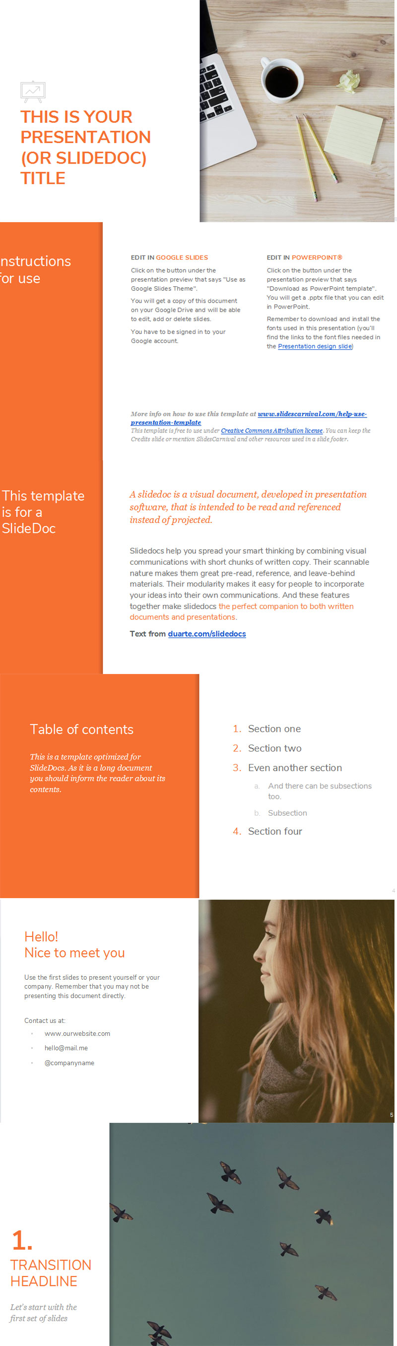 一个干净的主题,旨在以专业的格式呈现您的信息。这个免费的演示文稿ppt模板针对将作为工作文档打印或通过邮件发送的演示文稿(称为slidedocs)进行了优化,因此请注意,它不是屏幕投影幻灯片的理想选择。您可以保留活泼的橙色或选择其他与您的企业形象相匹配的颜色,因为所有元素和幻灯片都是可自定义的,可以轻松编辑它们以满足您的要求。该主题为您提供了有效传达信息并在下一次会议中给听众留下深刻印象所需的所有工具。