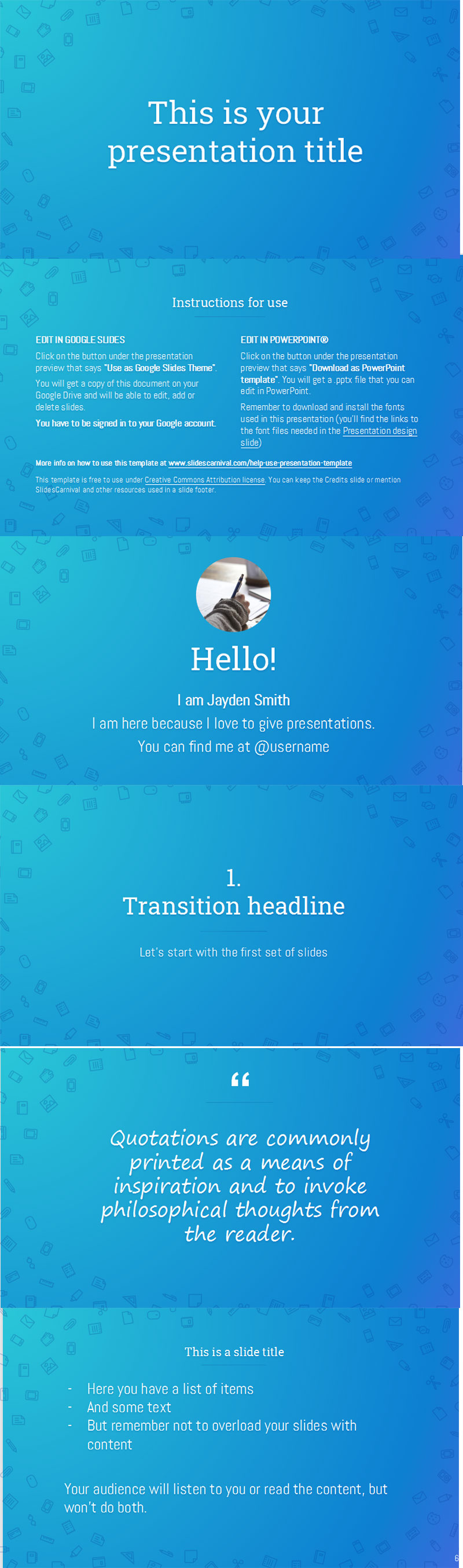 使用这个生动的免费ppt模板轻松创建引人入胜的幻灯片演示文稿。凭借使用图标图案的插图背景,该主题将适合团队合作、新项目提案或您的下一个数字战略的主题演讲。在一分钟内自定义幻灯片,更改与您的品牌或主题相匹配的背景颜色。由于图标是半透明的,因此它们适用于任何渐变或颜色!此外,所有形状和设计元素都是完全可编辑的。无论您是学生、在初创公司工作还是在大公司工作,都可以使用此主题以时尚的方式展示您的想法。
