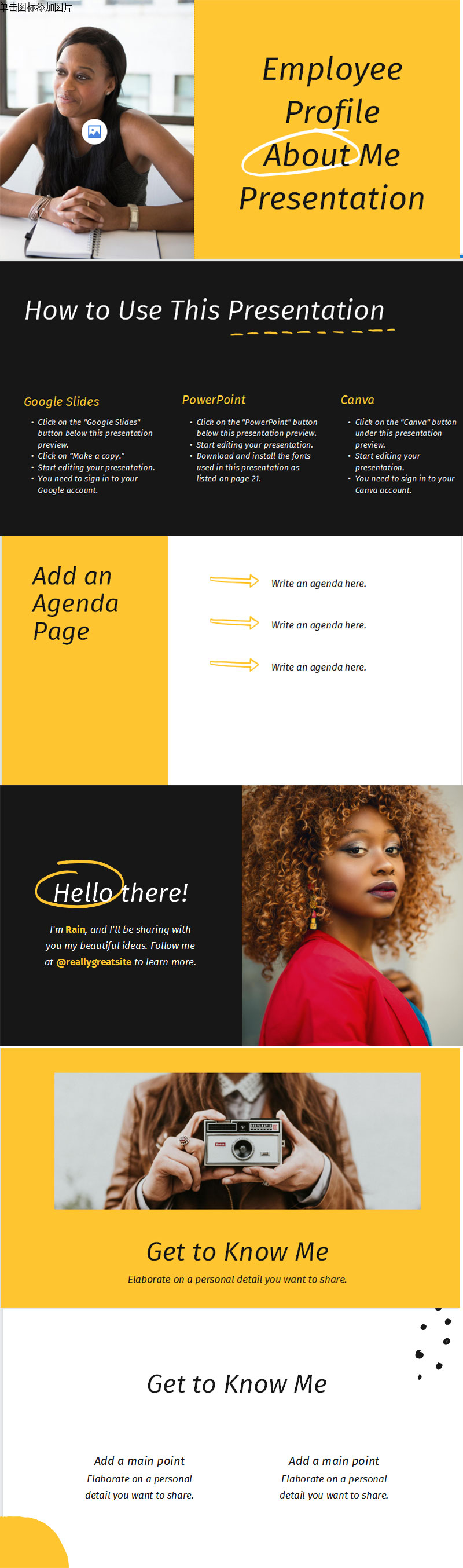 这些黄色和黑色的关于我的员工简介幻灯片简单而大胆,可以针对任何职位或行业进行定制。接下来,查看引人注目的现成布局,其中包含个人简介、爱好、有趣的事实、鼓舞人心的名言等页面。您可以坚持使用已有的布局,也可以根据自己的喜好对其进行自定义。添加任意数量的文本,上传您自己的图像和照片,并处理视频和音频剪辑。从图标和元素资源页面中汲取更多灵感。