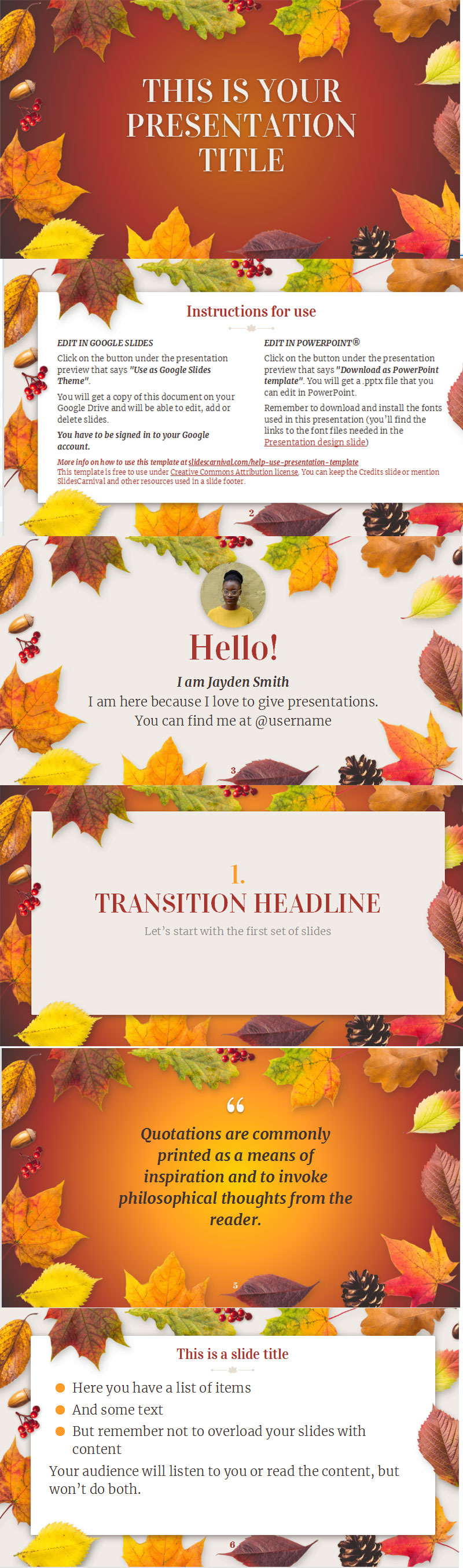 使用这个适用于 ppt 幻灯片的创意免费模板迎接秋季。温暖的颜色和树叶以其特有的秋天色调为这个设计营造了合适的氛围。在此模板中,您还会找到大量资源(图表、图标、地图等)来支持您的内容并使整体更加直观。在谈论秋天时,这是一个多用途的主题,但也可以用来展示新的服装系列或宣传秋季销售。
