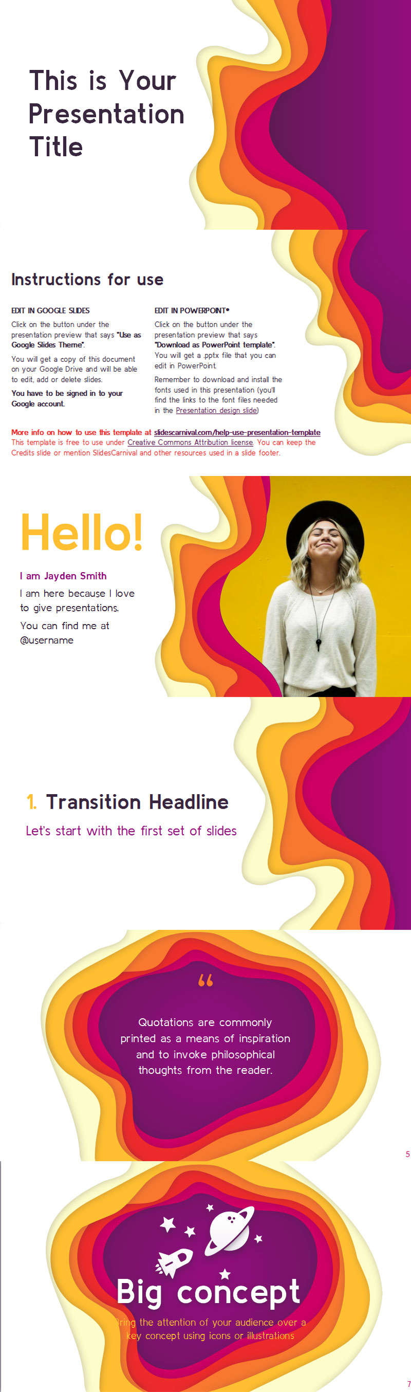 您想在下一次演示中引起注意吗?那么您应该使用这个适用于ppt 幻灯片的大胆而多彩的免费模板。这种设计模仿了最近流行的剪纸艺术。您可以保留彩虹色或将它们更改为与您的品牌颜色相同范围的阴影,以使其更具企业色彩。利用随附的可自定义图标和布局,以直观的方式解释复杂信息并强化您的想法。不要再担心设计,选择这个主题来激励和影响您的观众