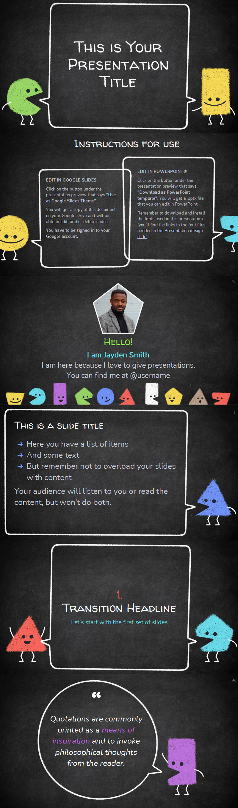 使用这个有趣的免费ppt模板,从第一分钟开始教授您的下一课并吸引您的学生。此设计在黑板背景上采用涂鸦风格的几何字符。除了超级可爱之外,这个教育演示文稿也非常多才多艺。您会发现许多不同的资源,如地图、信息图表、图标……您甚至可以创建自己的角色!。这个主题非常适合几何课,但事实是这些粉笔小伙子可以呈现任何主题。想象力发挥到淋漓尽致!