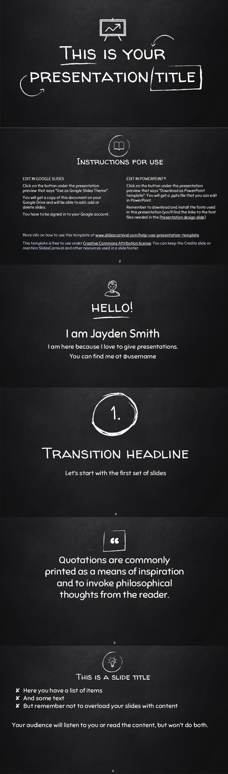 使用这个黑板风格的免费ppt演示文稿模板回忆旧学校的日子。字体和图标具有清新的手绘外观,白色使内容在深色纹理背景下显得格外醒目。谈论教育的绝佳模板