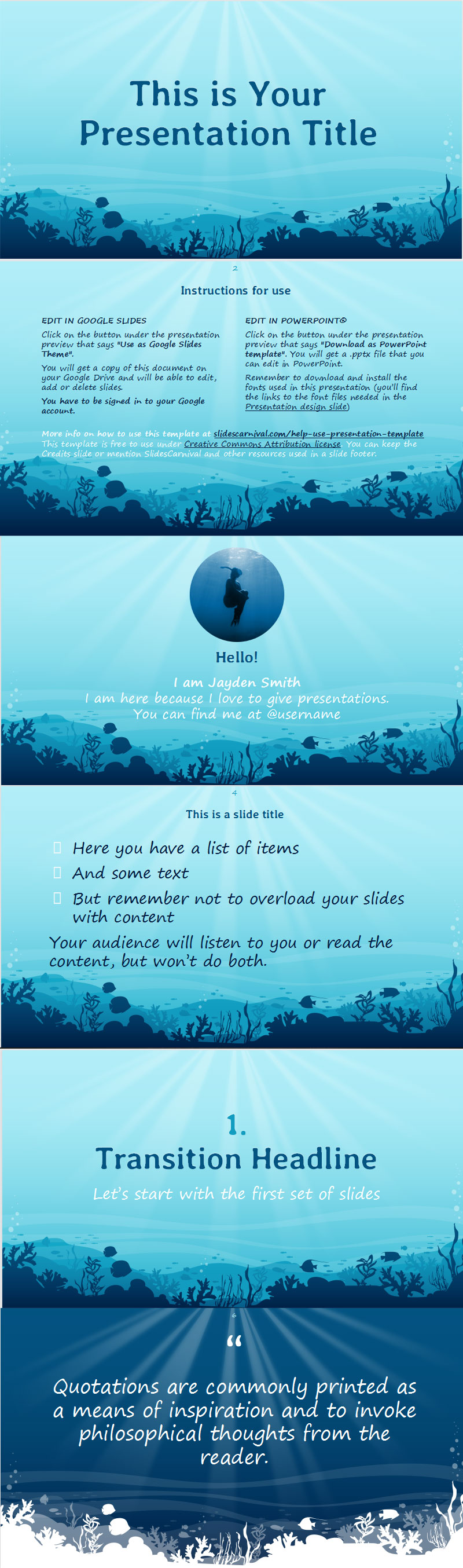 享受这个有趣的免费 ppt板或带有海底水下插图的 幻灯片主题。使用这个来自海底的模板,您的演示文稿将不再无聊。您甚至可以使用更浅或更深的蓝色调来表示不同的深度。此外,所有的鱼剪影都是可编辑的,您还可以更改它们的颜色。这是向儿童观众介绍海洋生物、海洋保护、海洋资源可持续利用甚至潜水的绝佳主题。在您的下一堂课或演讲中取悦您的年轻听众!