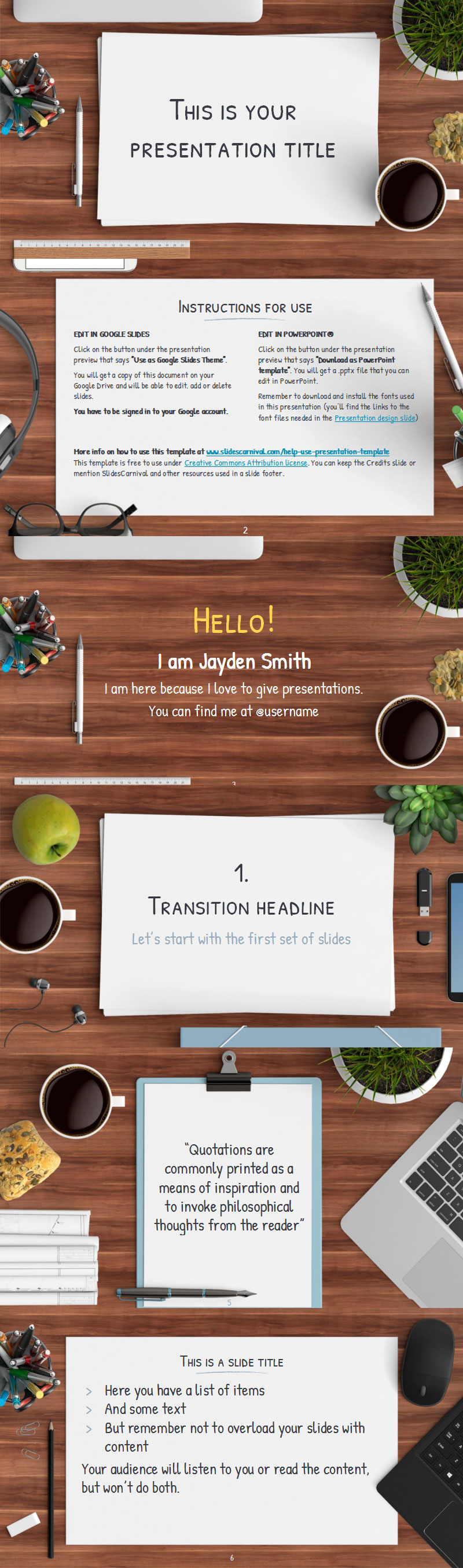 这个免费的ppt演示文稿模板使用逼真的办公桌图形,从上面可以看到办公桌上的文具。您的内容放在桌面上的文件中,就好像您自己手写的一样,手绘图标具有个人风格。这是一个很好的模板,可用于教育演示,但如果您的目标是让您的演讲具有非正式的感觉并尝试在个人层面上与您的听众接触。