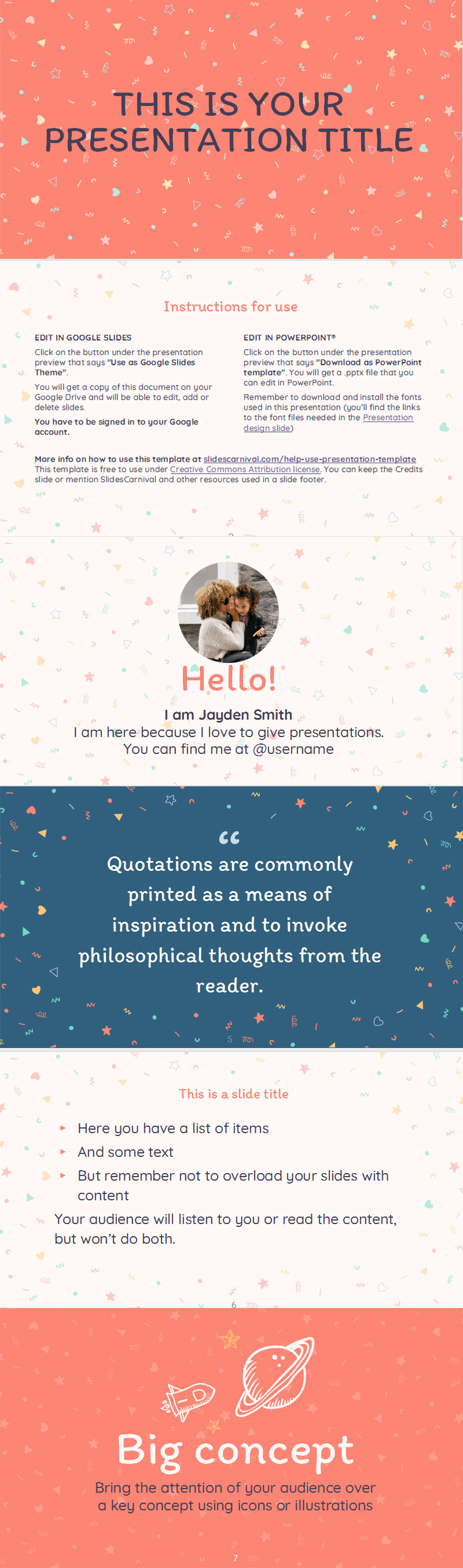 您是否需要制作偏离标准的 ppt演示文稿?然后选择这个可爱的免费ppt模板。五彩纸屑背景和柔和的色彩给人一种友好而可爱的感觉。柔和的色调是否不适合您的演讲主题?没问题,输入母版幻灯片并单击几下即可更改颜色。一切都是可编辑的!使用图表、图标、地图和其他资源来充分利用您的内容。如果您要向儿童观众展示,这个主题是一个不错的选择,但它也可以让迎婴派对变得活跃起来,或者将您宝宝的照片发送给家人
