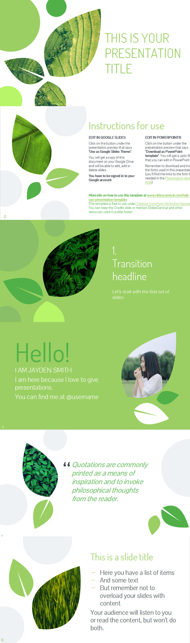 这个免费PPT模板采用以自然为灵感的设计,带有叶子和绿色调色板。凭借多种现代幻灯片布局和各种可编辑元素,该主题将完美展示您的想法。绿色是与成长、新鲜、创造力相关的颜色……尽管您可以将其更改为与您的品牌相匹配的颜色。由于叶子设计,您可以将此主题用于有关环境保护、绿色能源、农业甚至园艺的 PPT 幻灯片演示。借助这些时尚的视觉效果吸引观众的注意力。