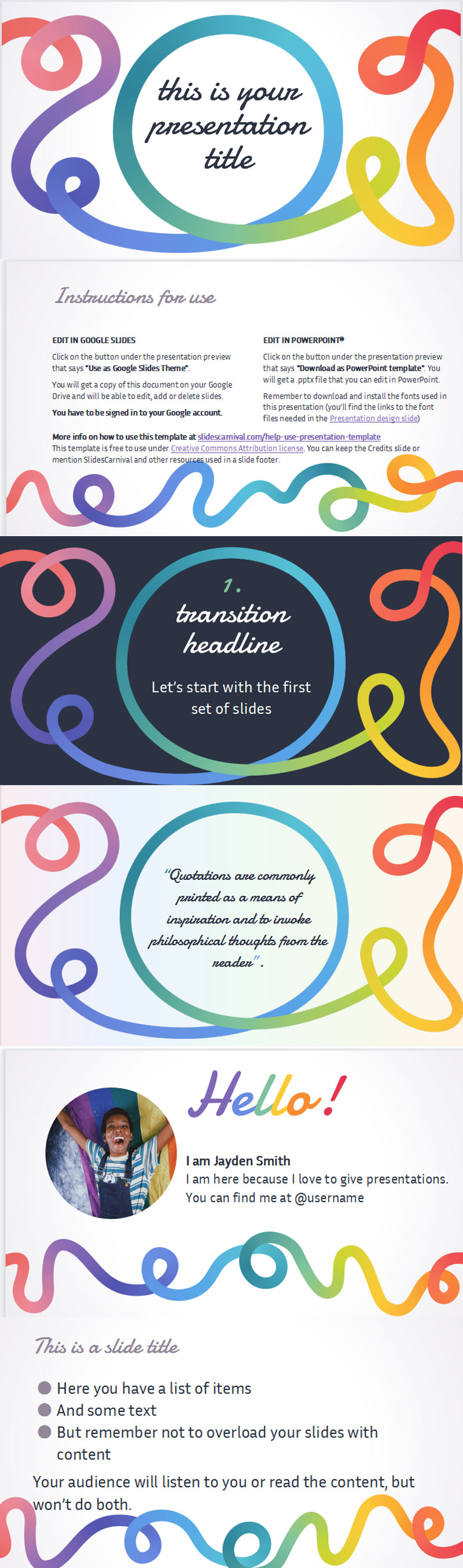 这个免费PPT模板在每张幻灯片中都显示了一条俏皮的彩虹色线条。在ppt模板中使用它,这种色彩缤纷的设计将使您的内容大放异彩。有许多可供选择的布局和大量有用的资源,您可以用一半的时间制作出有影响力的演示文稿。凭借其原创的外观和颜色,非常适合谈论 LGBTI、创意、艺术或音乐节