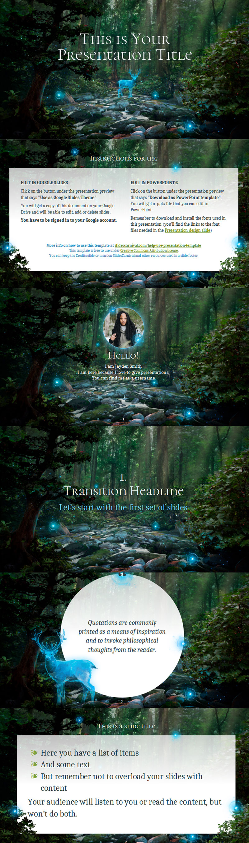 使用这个插图精美的PPT免费模板,为您的演示文稿增添一些魔力。让魔法森林的精神伴随您的内容,取悦并吸引您的观众。调色板围绕着绿色调,代表丰富的植被,使您的演示与环境和保护主题相协调。图形元素将帮助您尽可能清楚地传达您的内容,因此请毫不犹豫地使用包含的不同布局、地图、图形和图标。它不仅适合与自然相关的演示,您还可以用它来谈论神话、民间传说或奇幻小说。