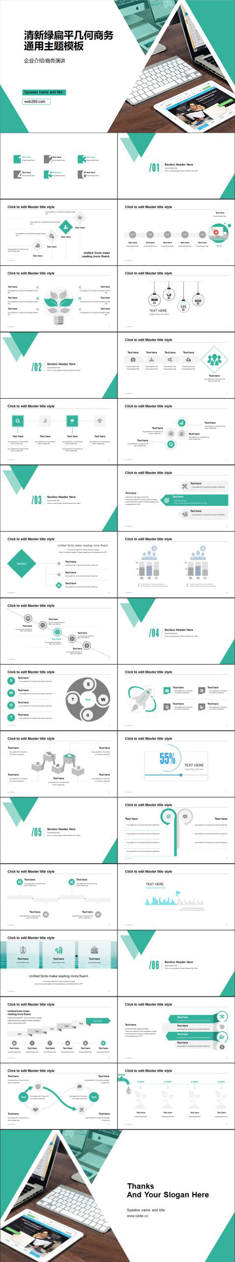 模板概述 该PPT共计32页,主题为简约商务风。 详细介绍 该PPT模板分4个部分,每个部分都包含丰富的逻辑图示素材、图表素材、版式和素材,非常丰满而实用。 适用范围 营销推广、工作规划、企业介绍、工作总结、商务演讲、商业计划书等