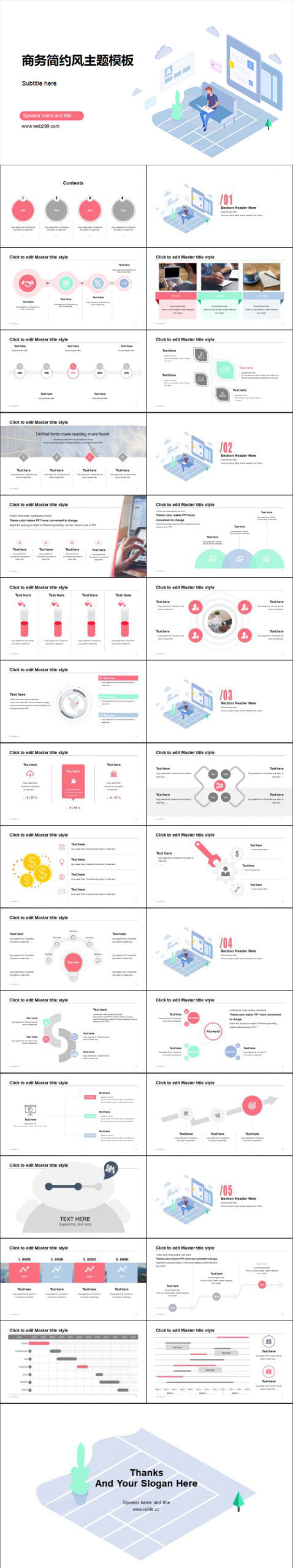 模板概述 该PPT共计32页,主题为简约商务风。 详细介绍 该PPT模板分4个部分,每个部分都包含丰富的逻辑图示素材、图表素材、版式和架构表,非常丰满而实用。 适用范围 个人简历、工作规划、自我介绍、职业发展、商务演讲等