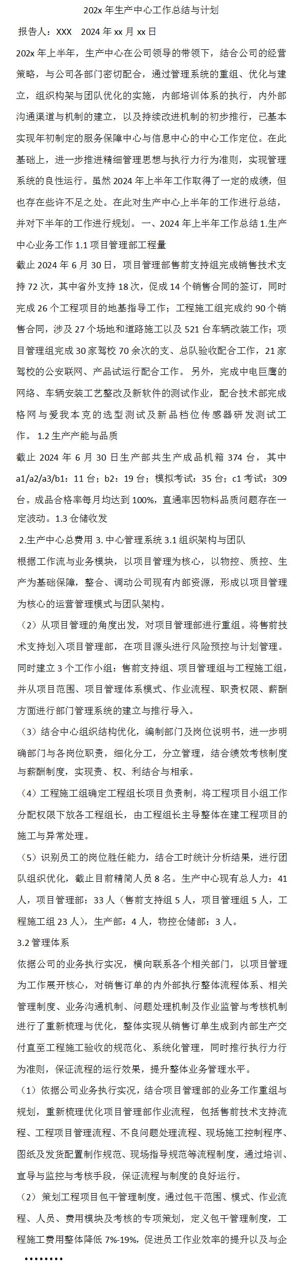 202x年生产中心工作总结与计划Word模板