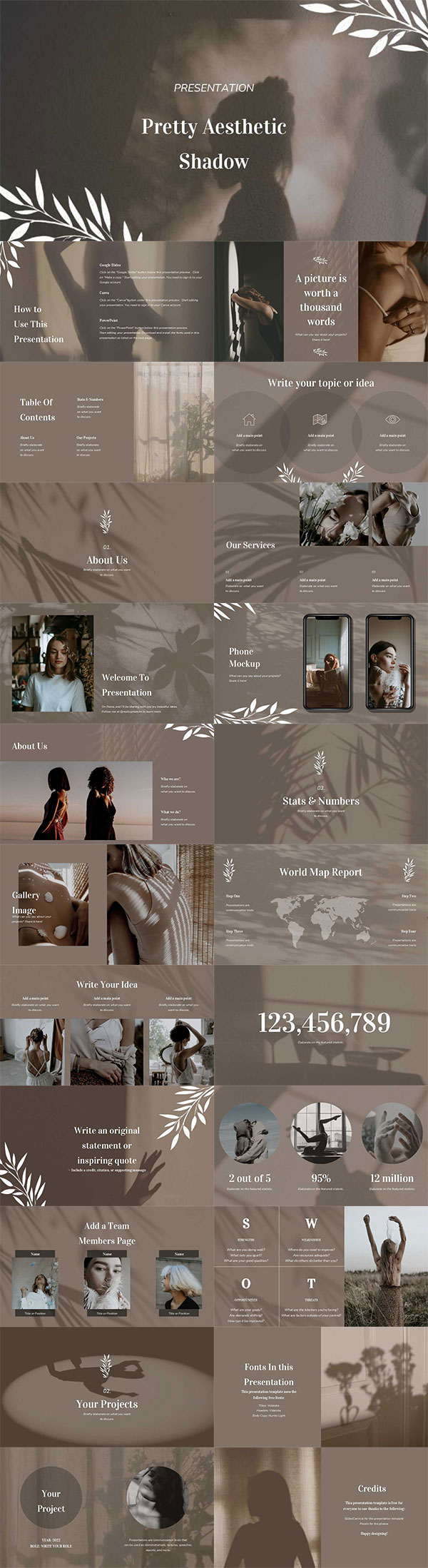 这些漂亮的影子幻灯片大胆而梦幻,非常适合用作幻灯片模板、ppt主题。用您的想法和想法装饰现成的幻灯片,无论您是领导专业项目还是个人项目。选择配色方案和字体组合。用图标、图像、插图、表情符号和其他图形唤醒您的模板。 超过 25 张现成的幻灯片,可根据您的喜好进行定制 数百种图表、框架、线条和形状可供选择 以多种格式轻松下载或共享