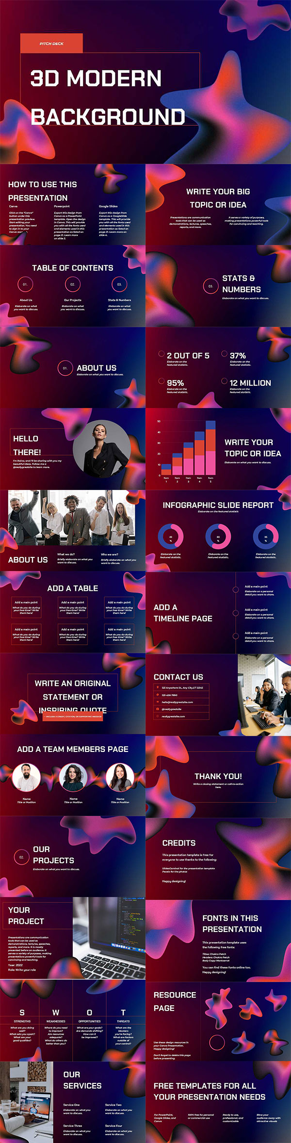 使用此 3D 现代背景主题为您的风格添加另一个维度,非常适合用作幻灯片模板、ppt 主题。这些幻灯片功能强大且专业,通过鼓舞人心的引述和想法、主题和陈述、团队成员简介、议程和时间表、图表和图表以及统计数据,让您保持正轨。选择您自己的配色方案和字体组合。添加图像、插图、徽标和其他图形。上传视频和音频剪辑。 超过 25 张现成的幻灯片,可根据您的喜好进行定制 数百种图表、框架、线条和形状可供选择 每张幻灯片的便捷动画和过渡功能