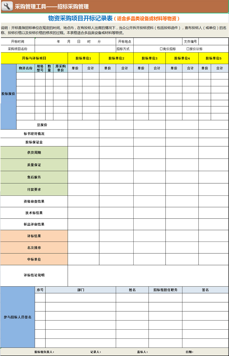 物资采购项目开标记录Excel表格(适合多品类物资)