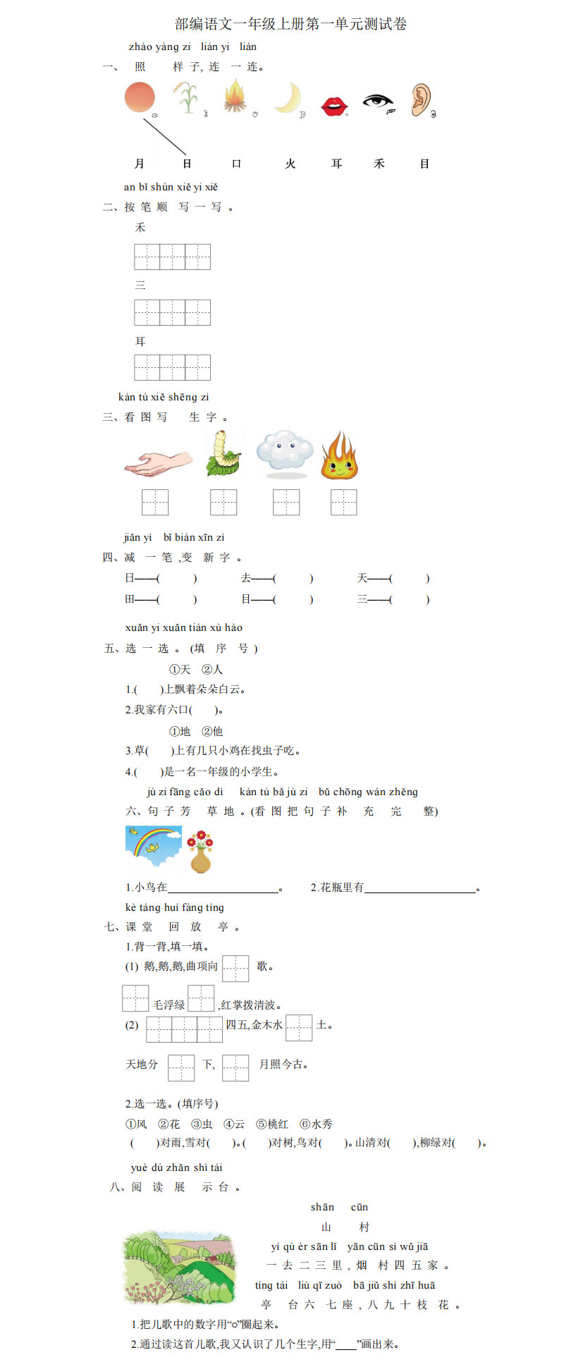 部编语文一年级上册第一单元测试卷,pdf格式,共4页,可打印下载