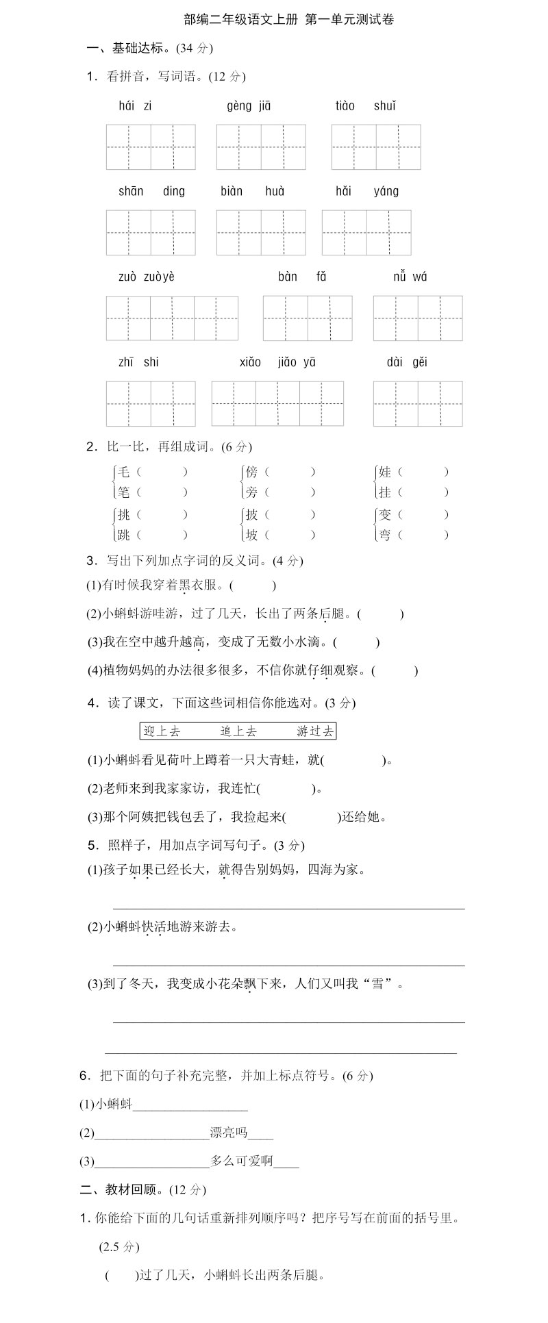 **部编二年级语文上册第1单元试卷 (2),pdf格式,共5页,可打印下载**