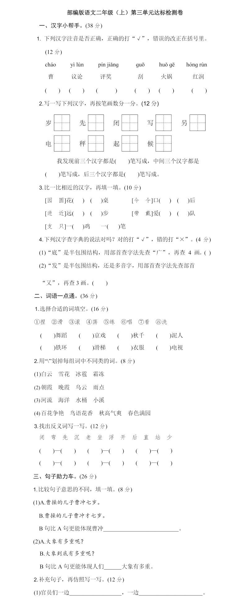 **部编二年级语文上册第3单元试卷 (3),pdf格式,共5页,可打印下载**