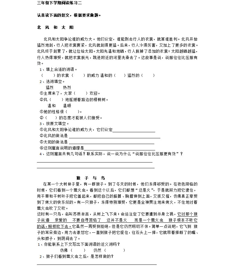 **三年级语文下学期阅读练习二,word格式,共2页,可打印下载**
