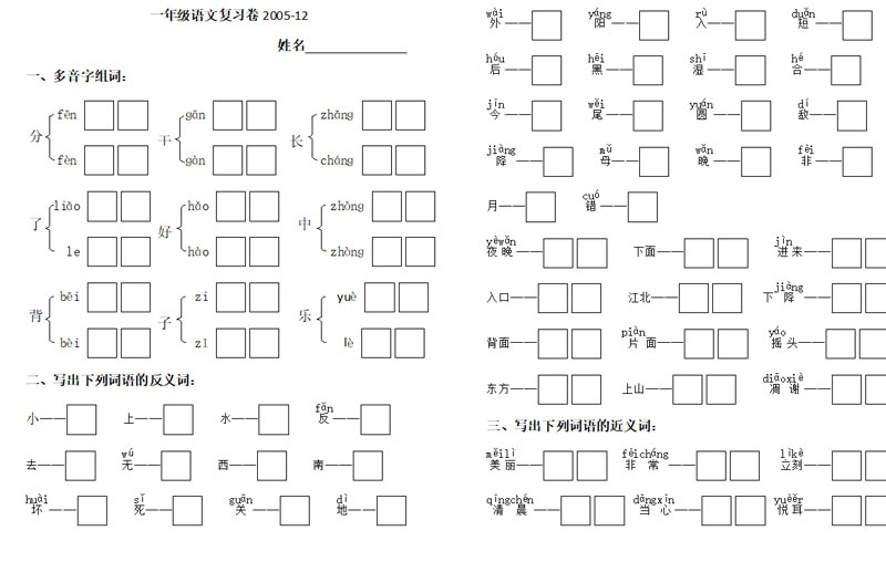 苏教版小学一年级语文上册多音字和近反义词练习题