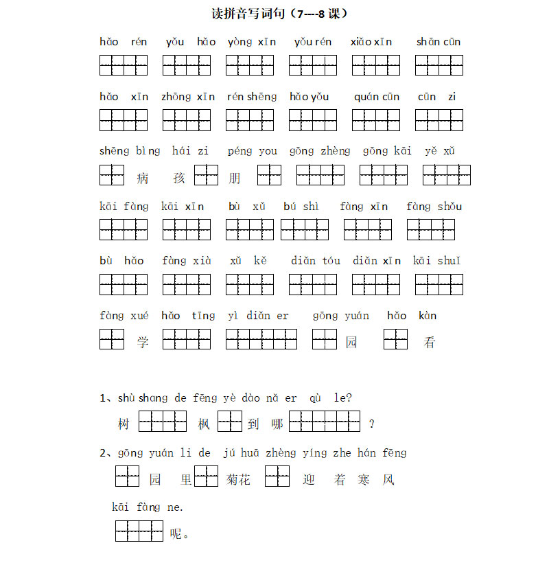 **苏教版小学一年级语文上册读拼音写字词7--8课,word格式,共1页,可打印下载**