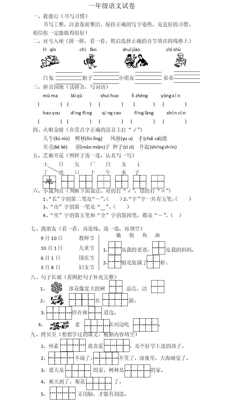 **小学一年级语文试卷,word格式,共1页,可打印下载**