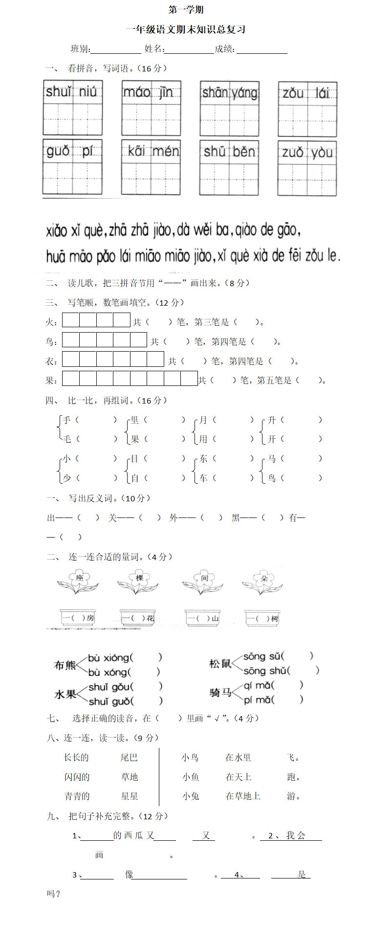 **人教新课标一年级语文上册总复习试卷,word格式,共2页,可打印下载**