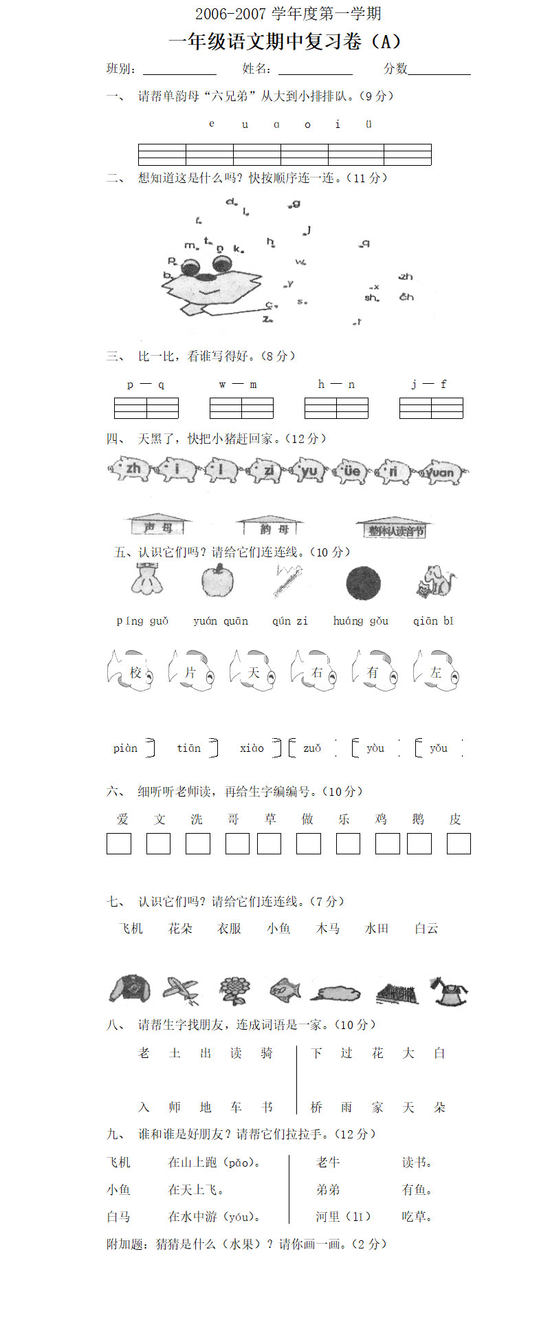 **人教版新课标一年级语文上册期中复习试卷(A),word格式,共3页,可打印下载**
