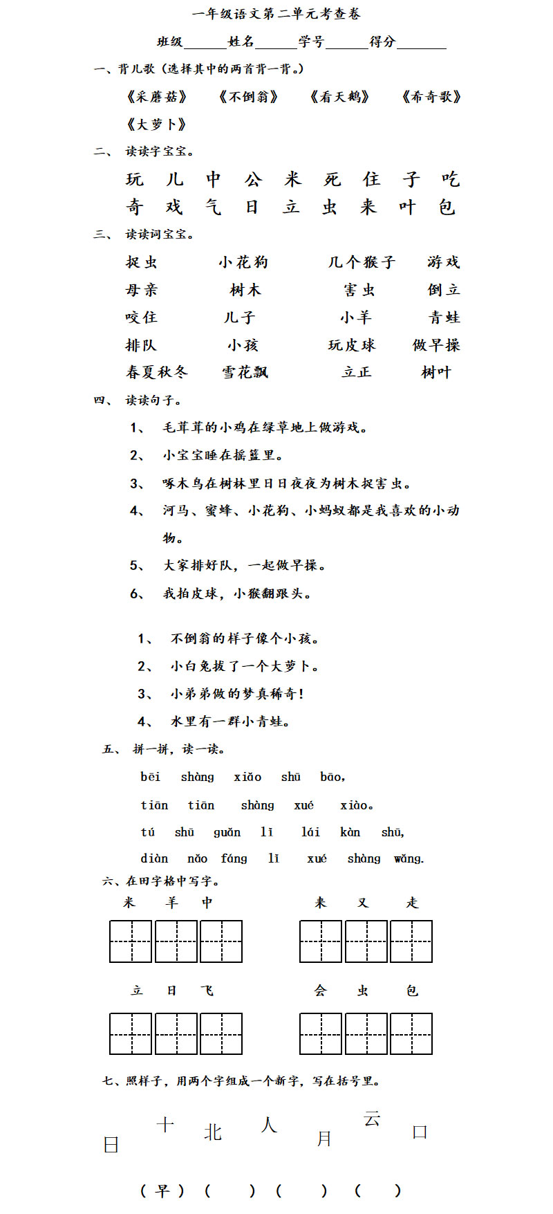 **人教版新课标一年级语文上册第二单元考查卷,word格式,共2页,可打印下载**
