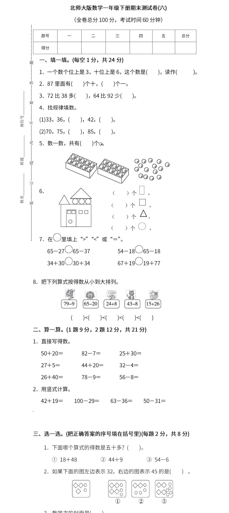 **北师大版数学一年级下册期末测试卷(六)及答案北师大版数学一年级下册期末测试卷(六)及答案,pdf格式,共5页,可打印下载**