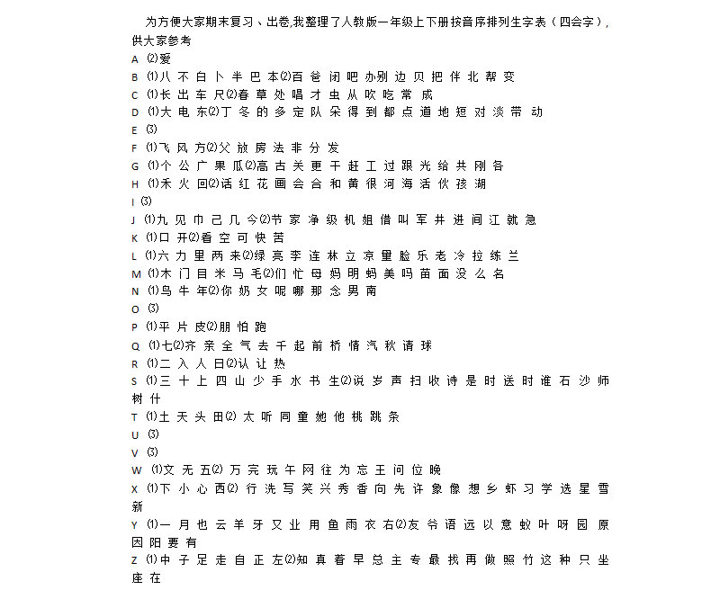 **一年级上下册按音序排列生字表,word格式,共1页,可打印下载**