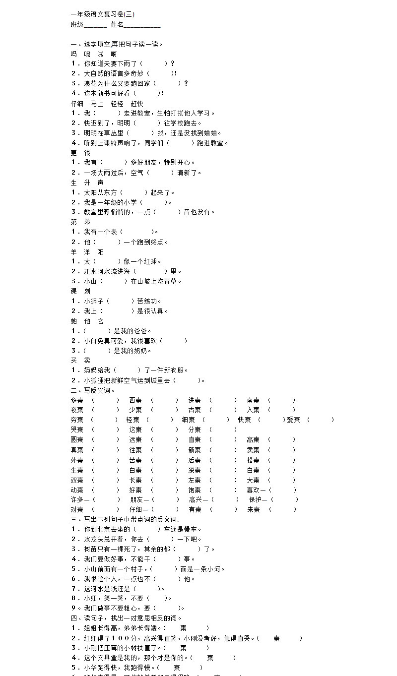 人教版新课标一年级语文下册语文复习卷3