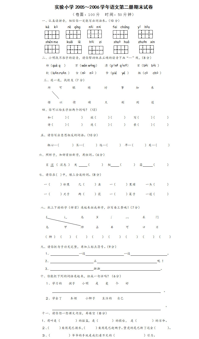 **北师大版2005~2006学年语文第二册期末试卷,word格式,共2页,可打印下载**