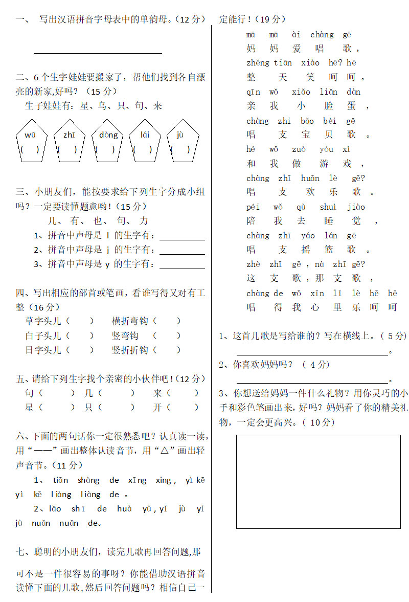 **人教新课标一年级语文上册复习题,word格式,共1页,可打印下载**