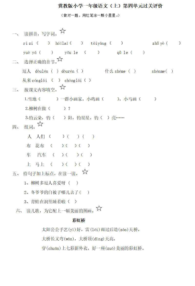 **冀教版一年级语文上册第四单元测试,word格式,共2页,可打印下载**